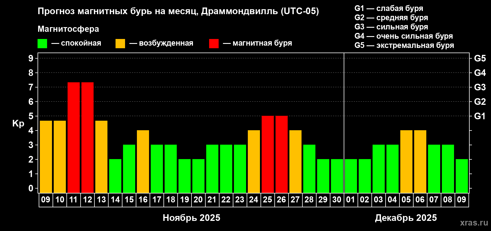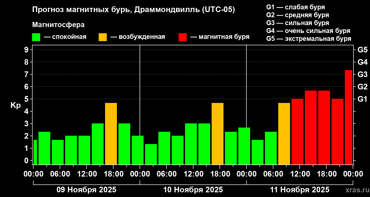 Прогноз магнитных бурь в Драммондвилле — 9 ноября 2025 года