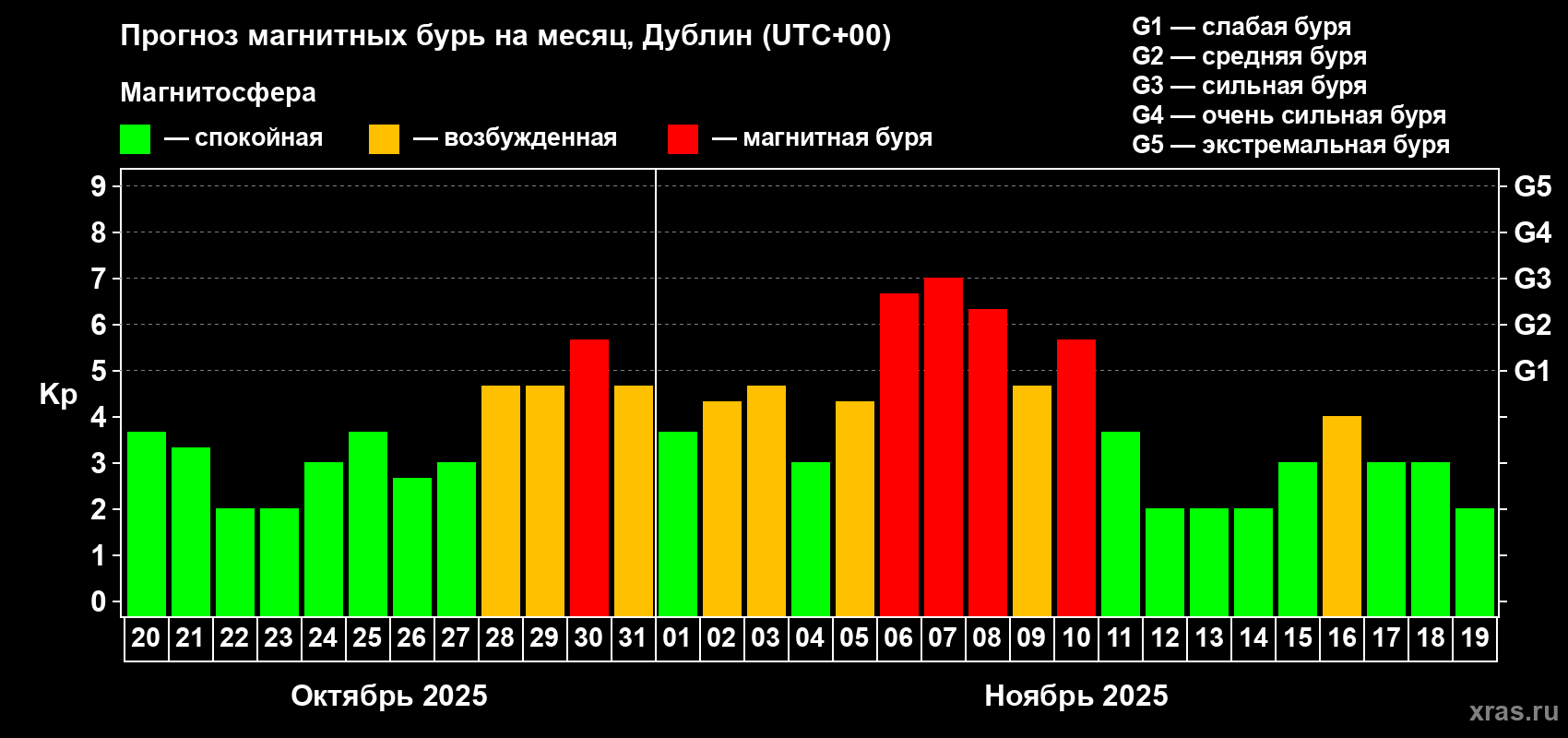 Прогноз магнитных бурь в Дублине — 20 октября 2025 года