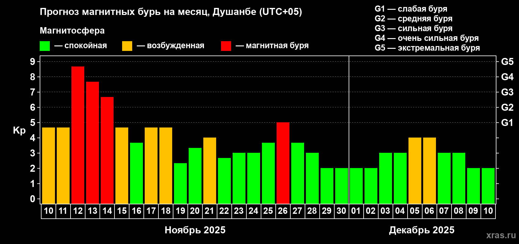 Прогноз магнитных бурь в Душанбе — 10 ноября 2025 года