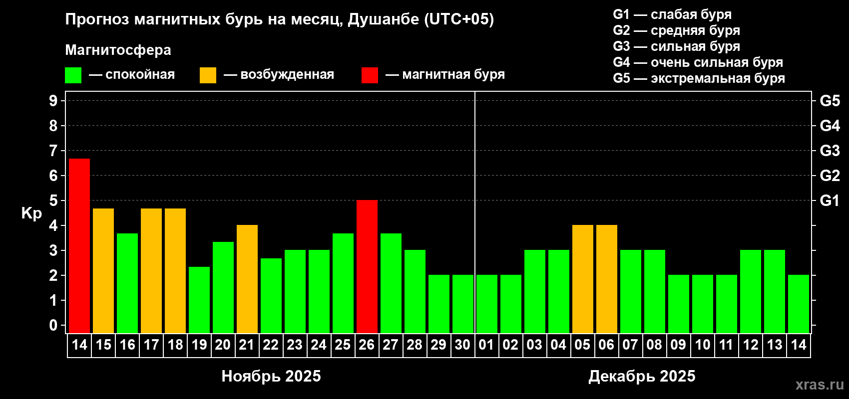 Прогноз магнитных бурь в Душанбе — 14 ноября 2025 года