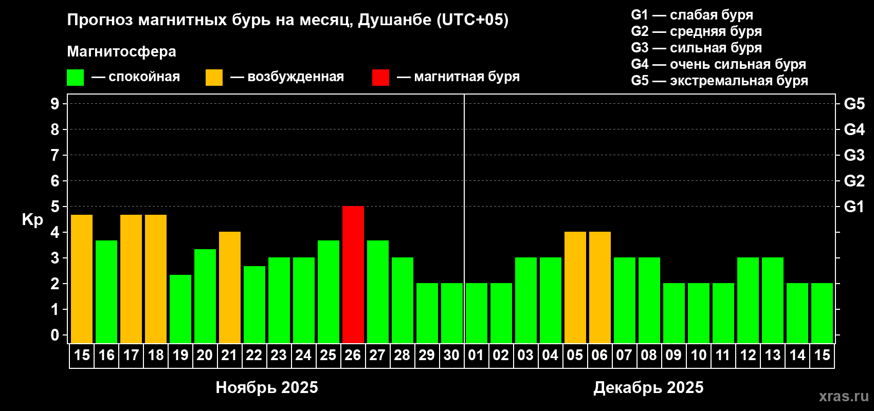 Прогноз магнитных бурь в Душанбе — 15 ноября 2025 года