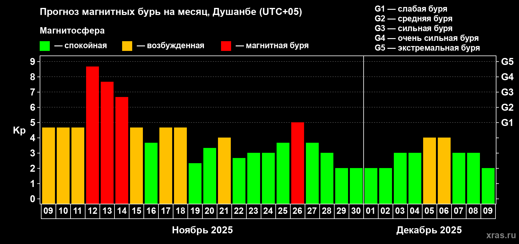 Прогноз магнитных бурь в Душанбе — 9 ноября 2025 года