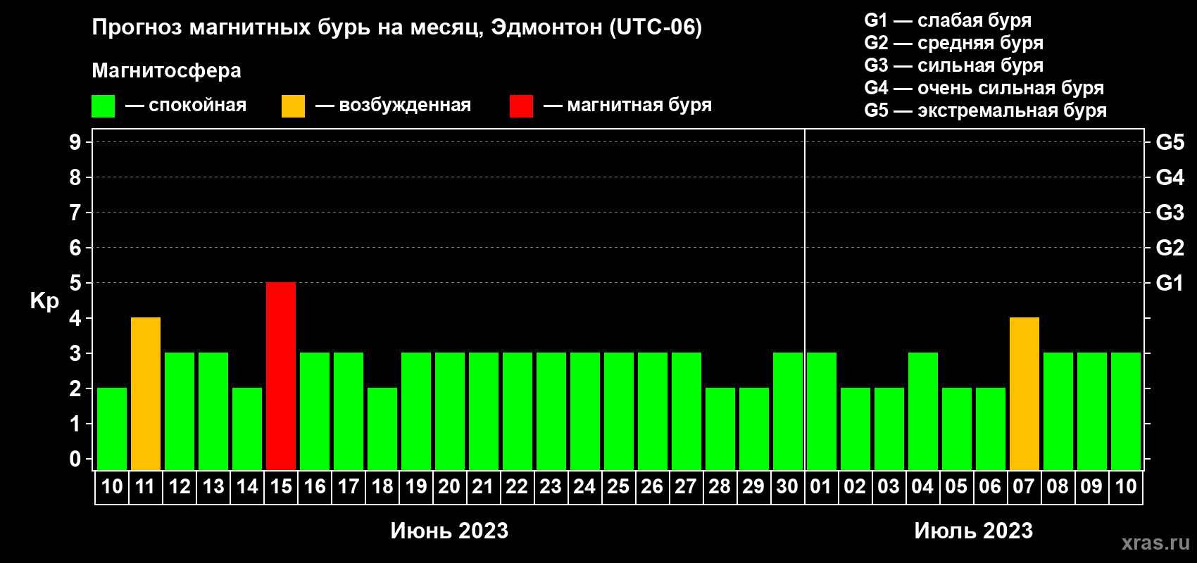 Прогноз магнитных бурь в Эдмонтоне — 10 июня 2023 года