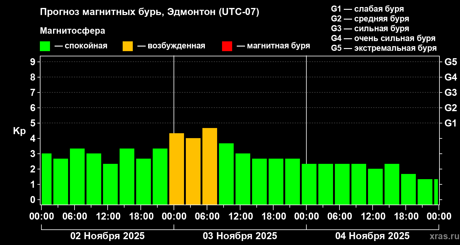 Прогноз магнитных бурь в Эдмонтоне на 2 ноября 2025 года