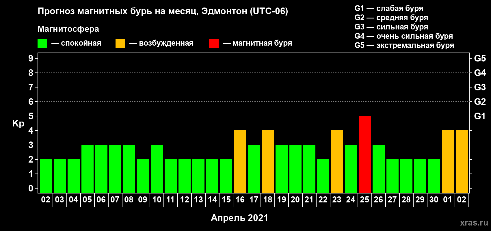 Прогноз магнитных бурь в Эдмонтоне на 2 апреля 2021 года