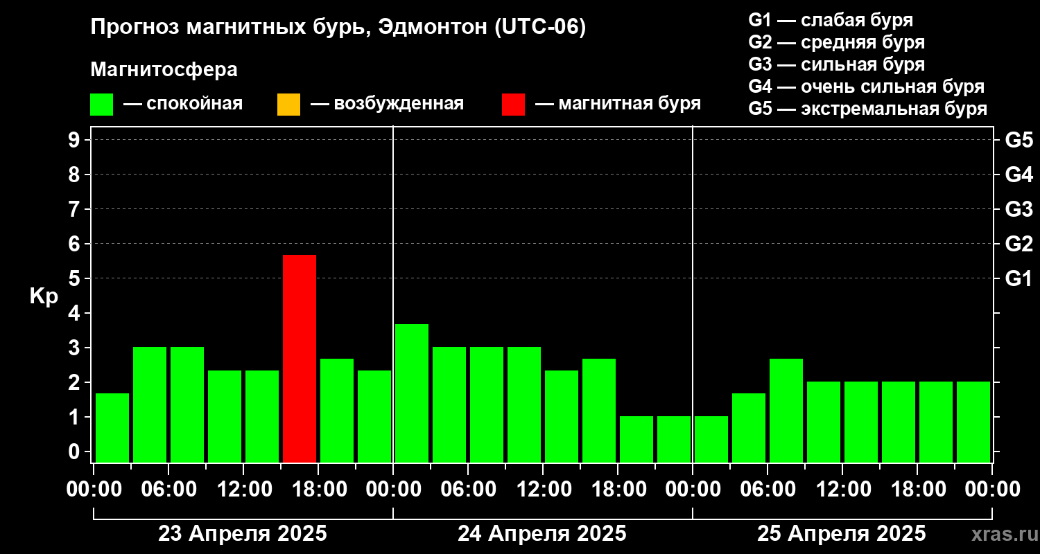 Прогноз магнитных бурь в Эдмонтоне на 23 апреля 2025 года