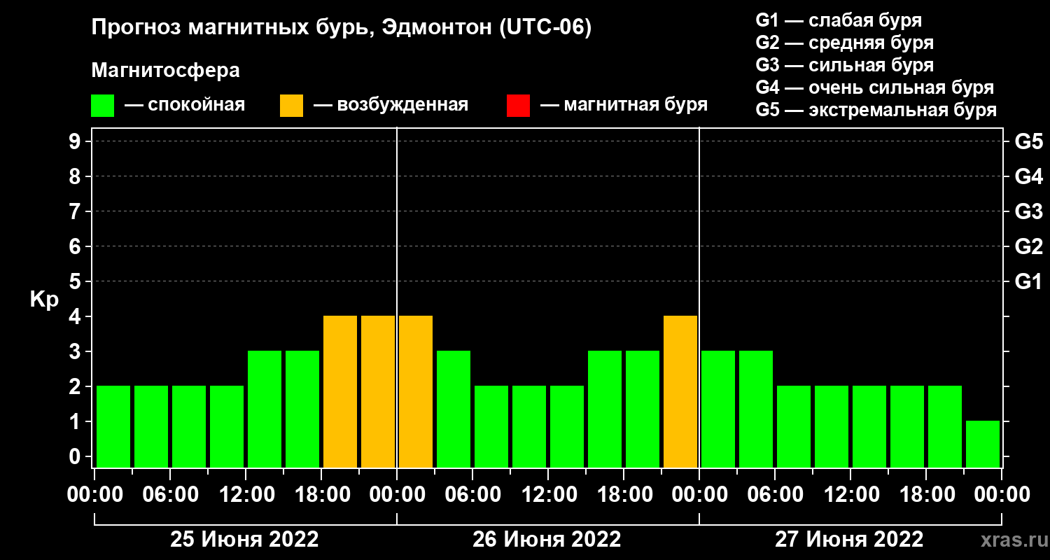 Прогноз магнитных бурь в Эдмонтоне на 25 июня 2022 года