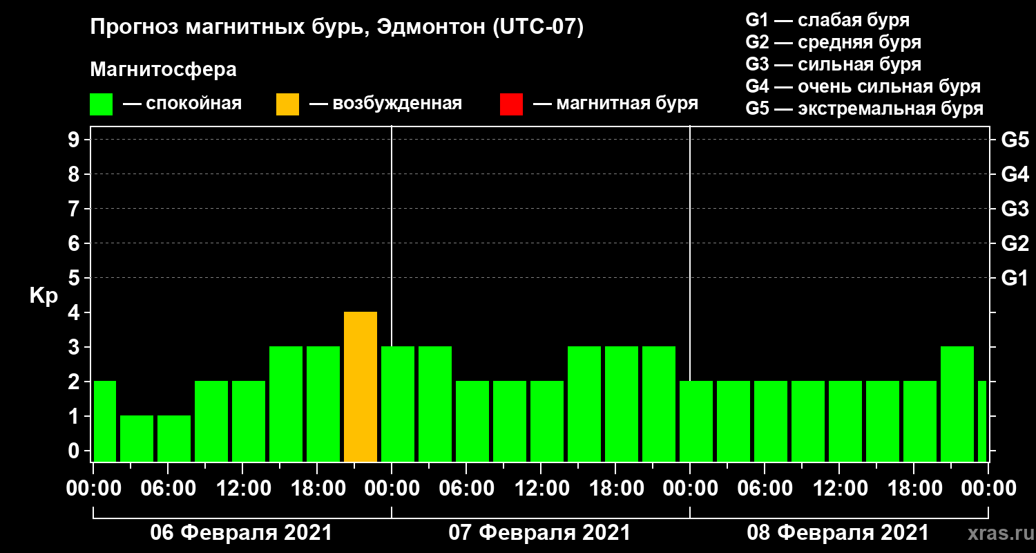 Прогноз магнитных бурь в Эдмонтоне на 6 февраля 2021 года