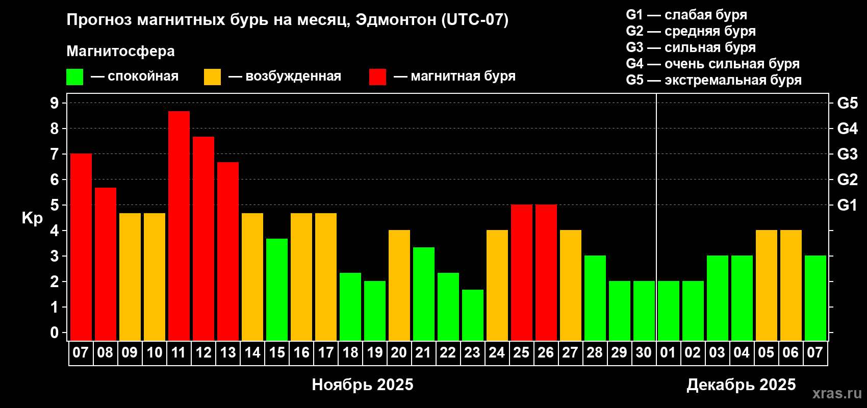 Прогноз магнитных бурь в Эдмонтоне — 7 ноября 2025 года