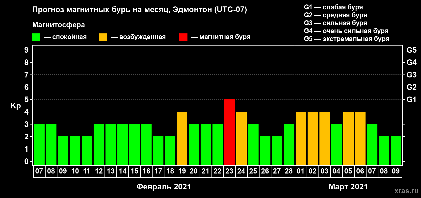 Прогноз магнитных бурь в Эдмонтоне на 7 февраля 2021 года
