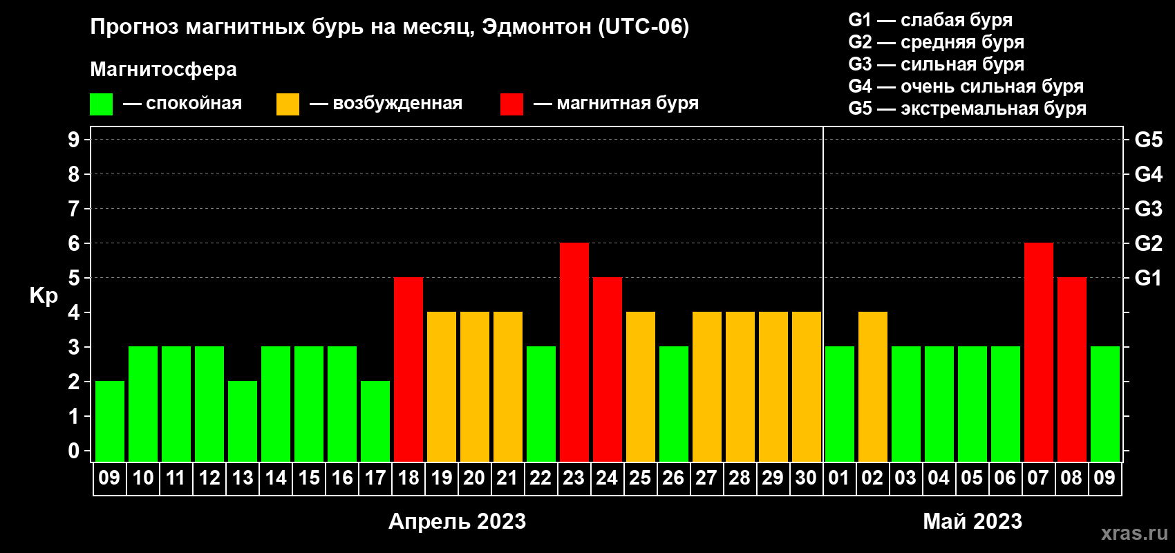Прогноз магнитных бурь в Эдмонтоне на 9 апреля 2023 года
