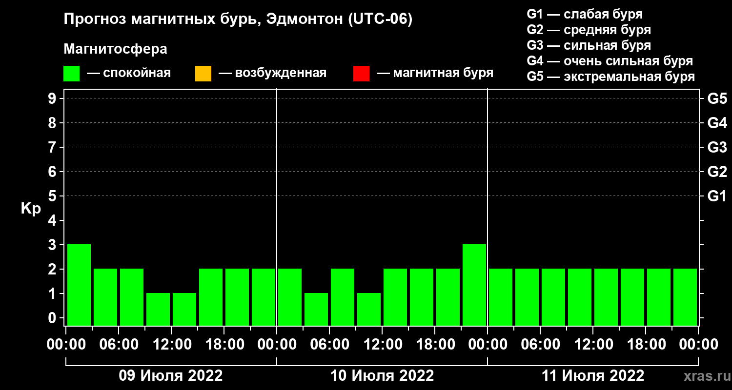 Прогноз магнитных бурь в Эдмонтоне на 9 июля 2022 года