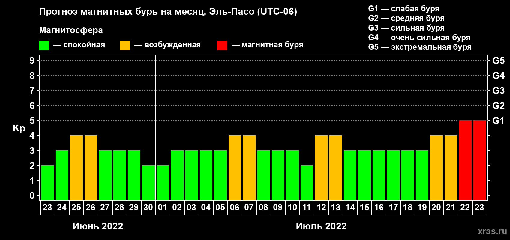 Прогноз магнитных бурь Эль-Пасо на 23 июня 2022 года
