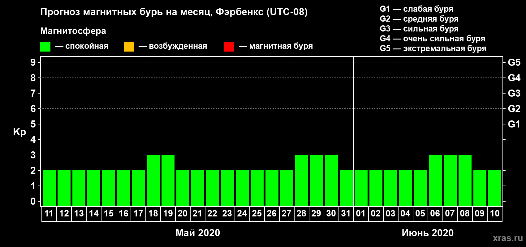 Прогноз магнитных бурь в Фэрбенксе — 11 мая 2020 года