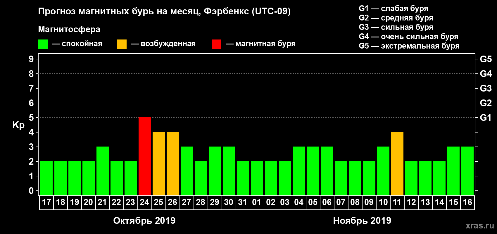 Прогноз магнитных бурь в Фэрбенксе — 17 октября 2019 года