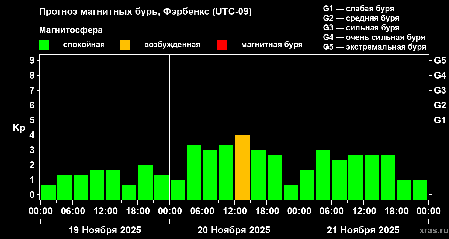 Прогноз магнитных бурь в Фэрбенксе — 19 ноября 2025 года