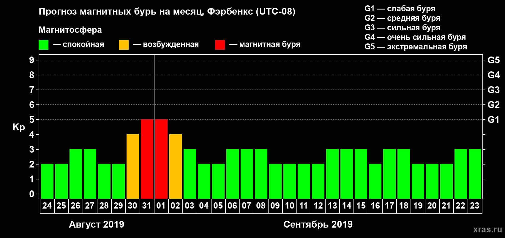 Прогноз магнитных бурь в Фэрбенксе — 24 августа 2019 года