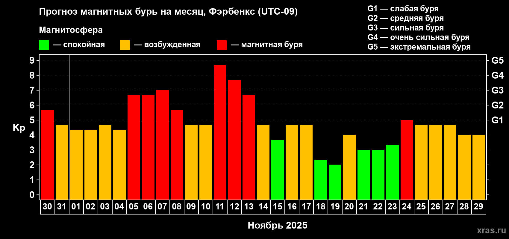 Прогноз магнитных бурь в Фэрбенксе — 30 октября 2025 года