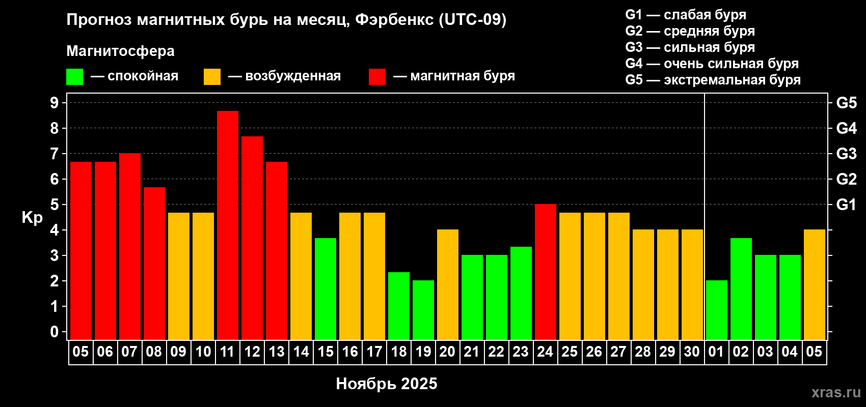 Прогноз магнитных бурь в Фэрбенксе на 5 ноября 2025 года