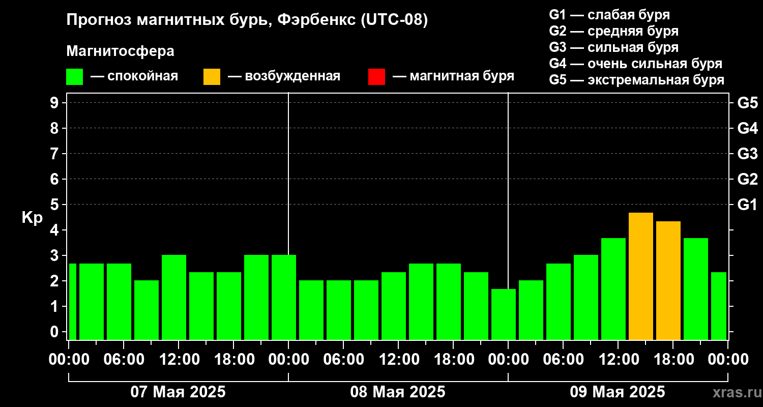Прогноз магнитных бурь в Фэрбенксе — 7 мая 2025 года