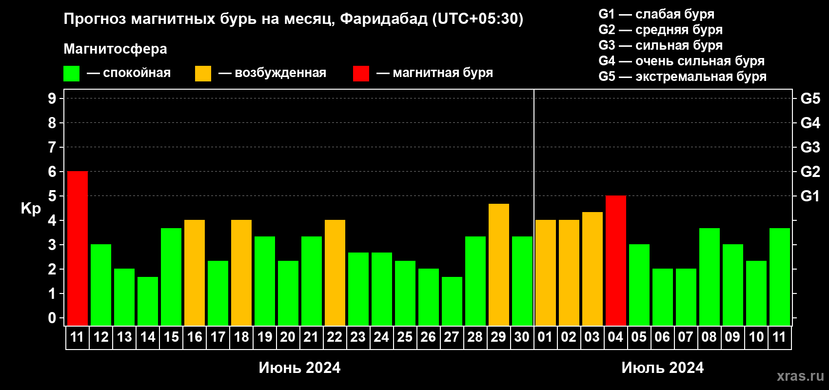 Прогноз магнитных бурь в Фаридабаде — 11 июня 2024 года