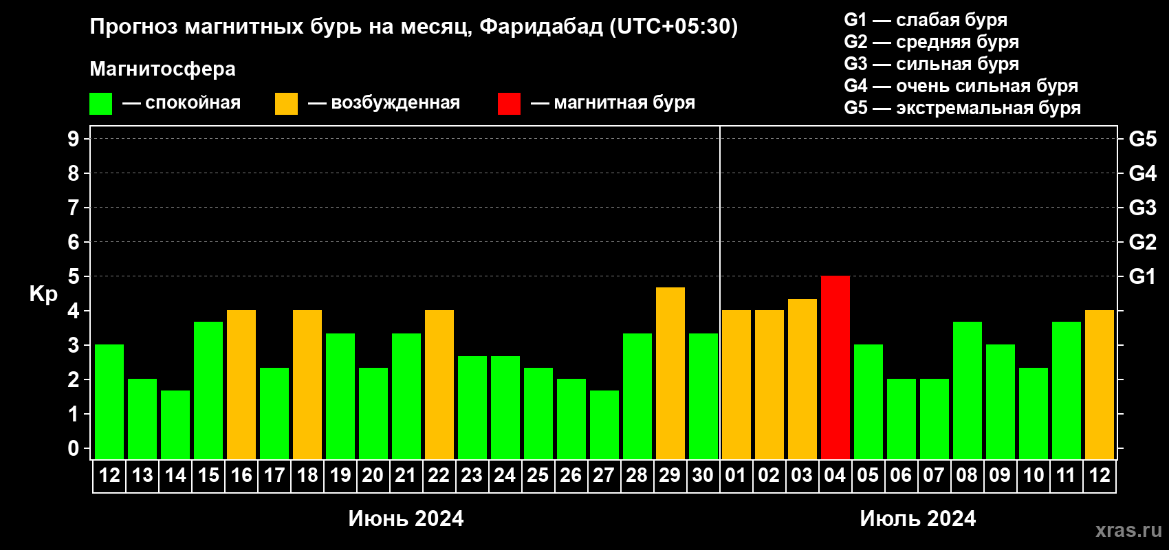 Прогноз магнитных бурь в Фаридабаде — 12 июня 2024 года