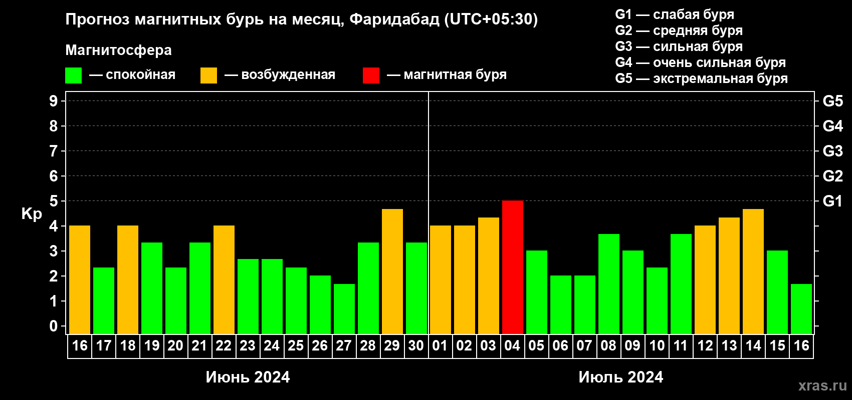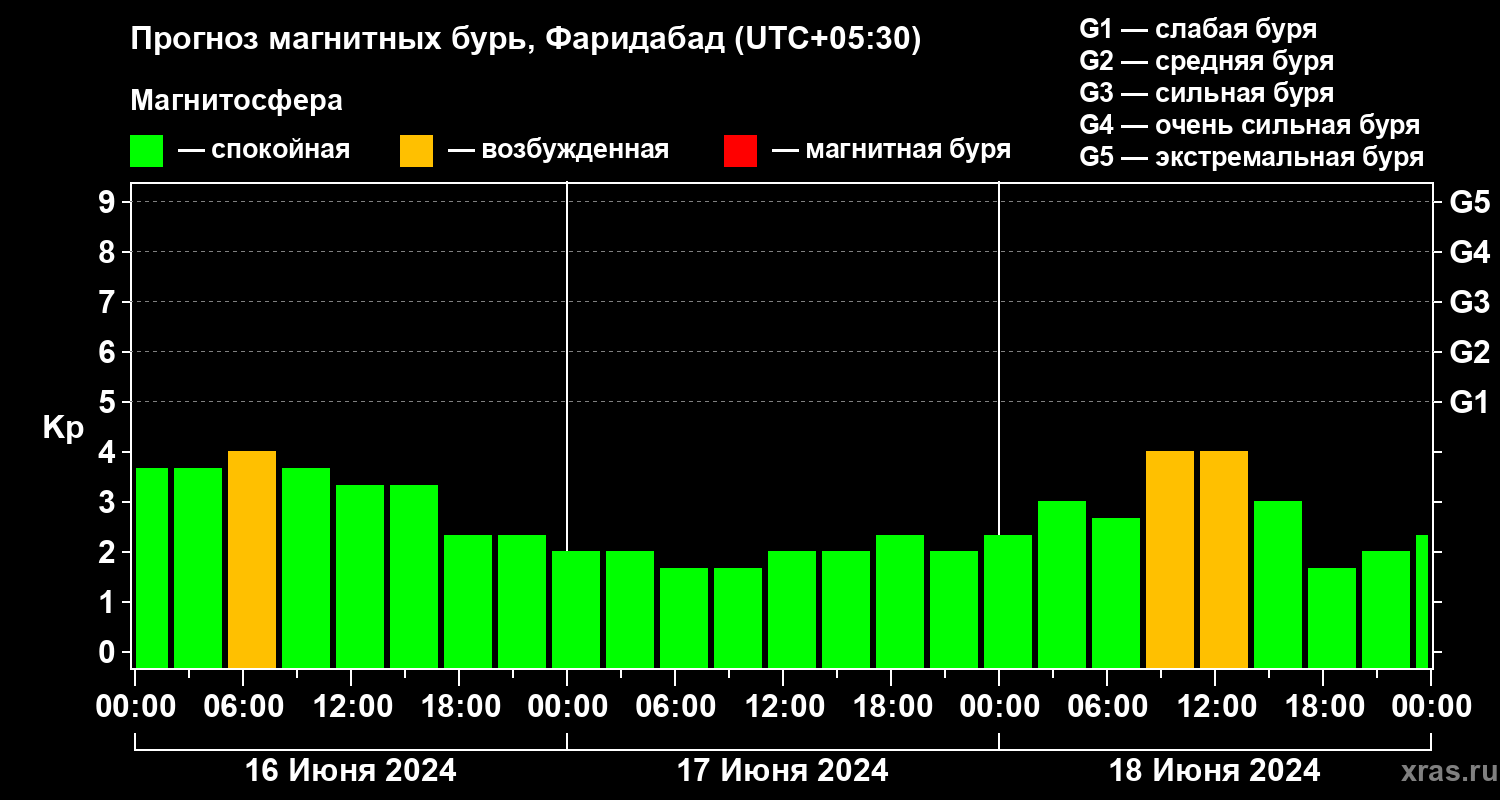 Прогноз магнитных бурь в Фаридабаде — 16 июня 2024 года