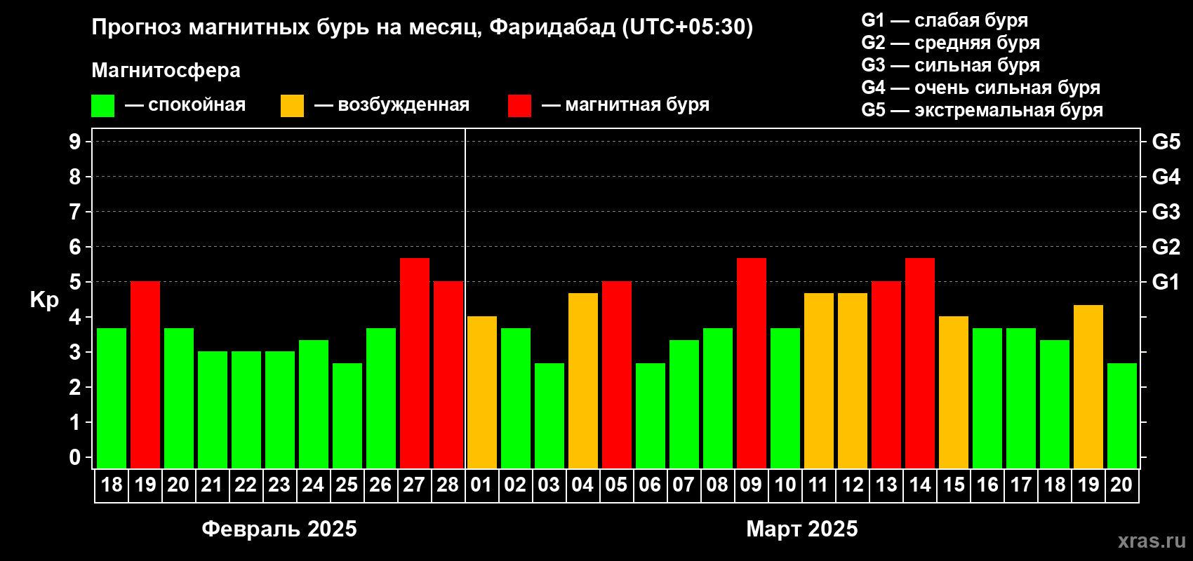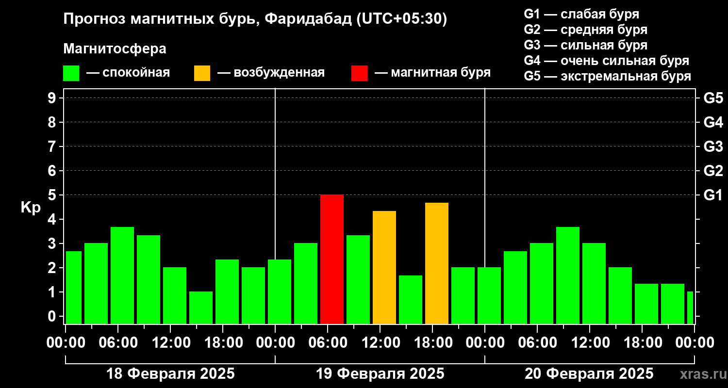 Прогноз магнитных бурь в Фаридабаде — 18 февраля 2025 года