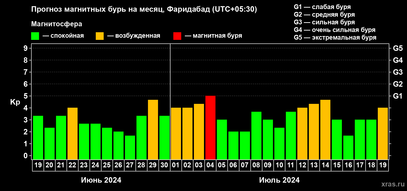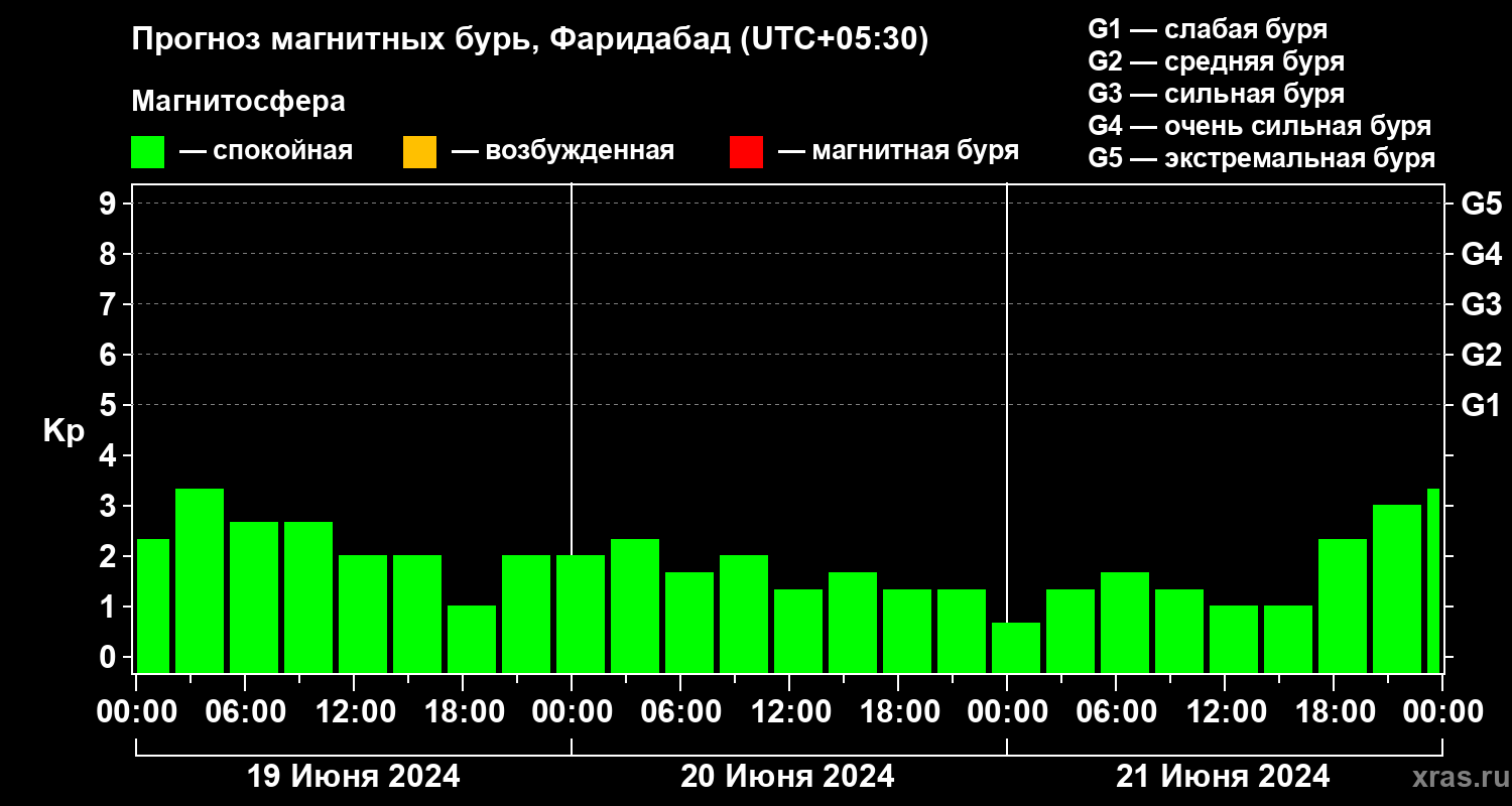 Прогноз магнитных бурь в Фаридабаде — 19 июня 2024 года