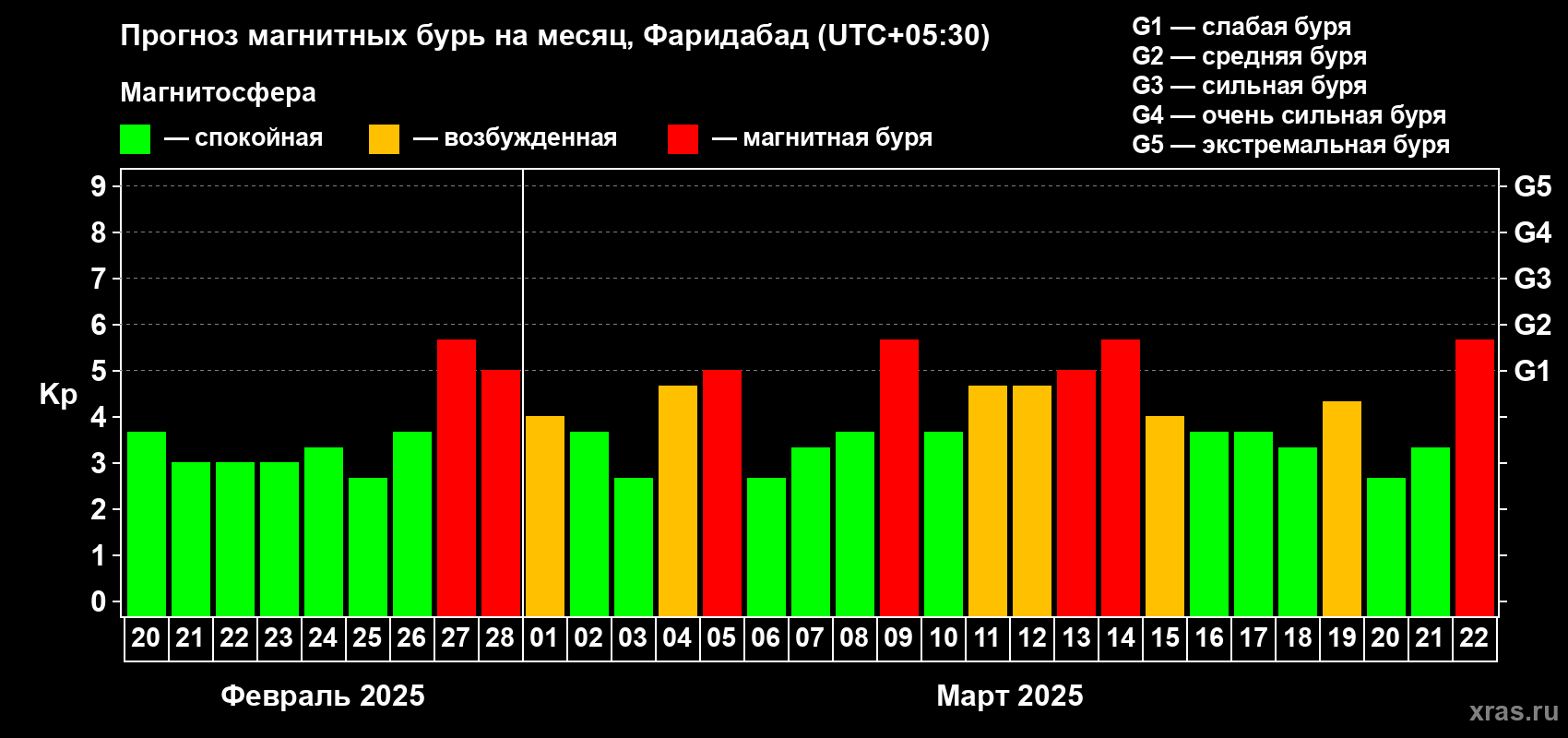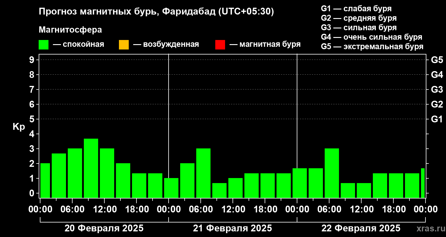 Прогноз магнитных бурь в Фаридабаде — 20 февраля 2025 года