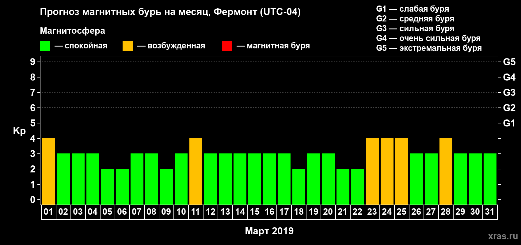 Прогноз максимального суточного геомагнитного индекса Kp на 1 месяц (31 день) с 01 марта по 31 марта 2019 г