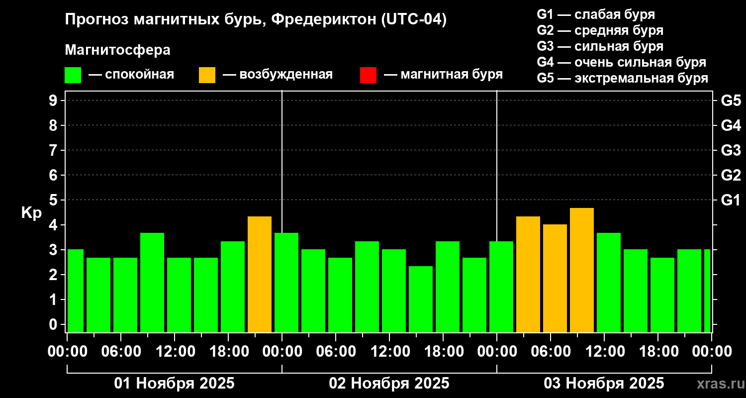 Прогноз магнитных бурь в Фредериктоне — 1 ноября 2025 года