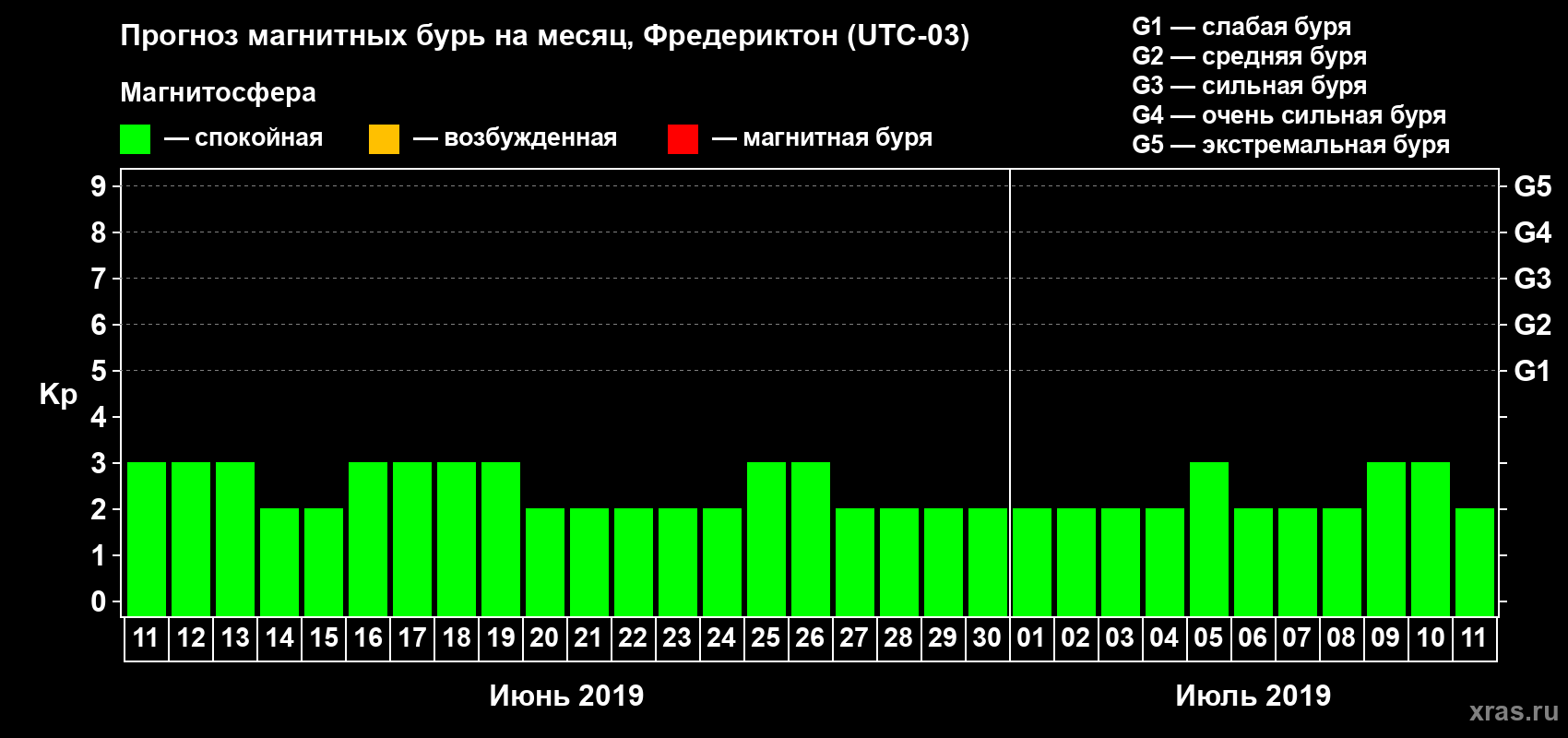 Прогноз магнитных бурь в Фредериктоне — 11 июня 2019 года