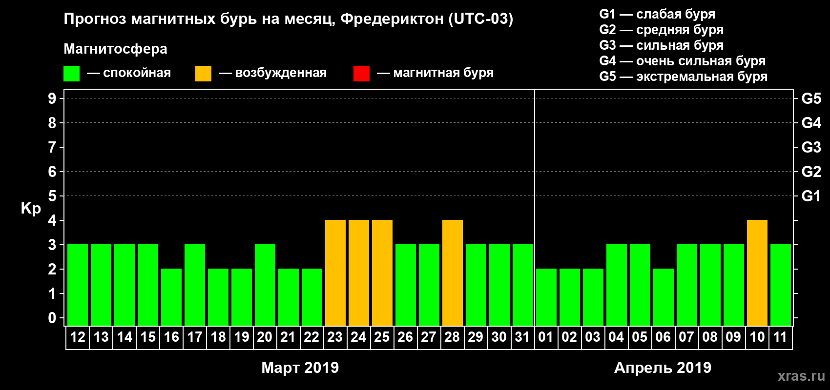 Прогноз магнитных бурь в Фредериктоне — 12 марта 2019 года