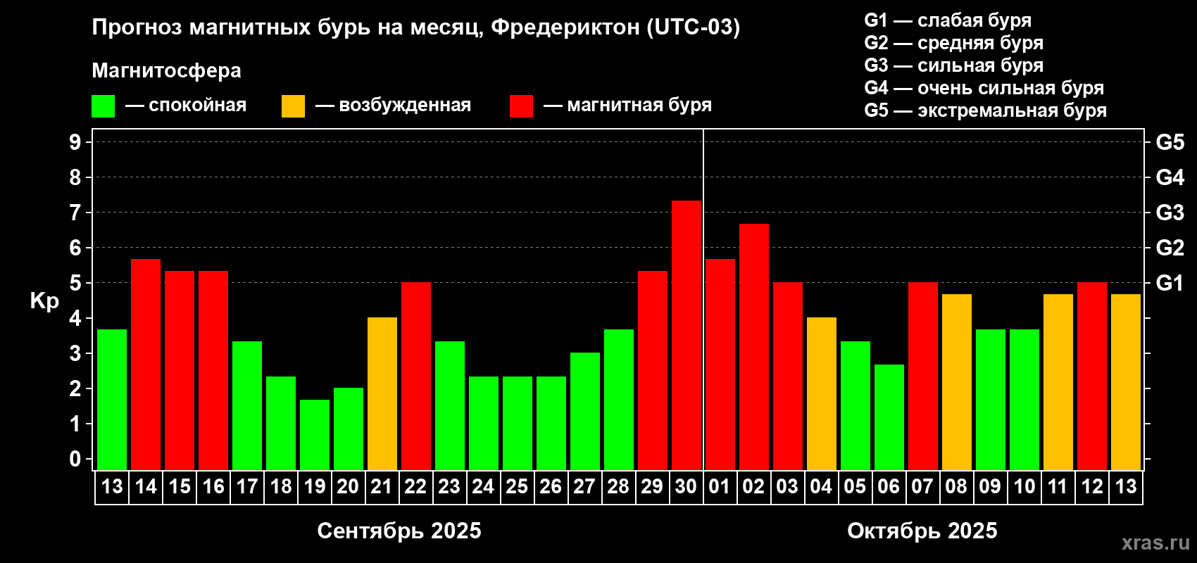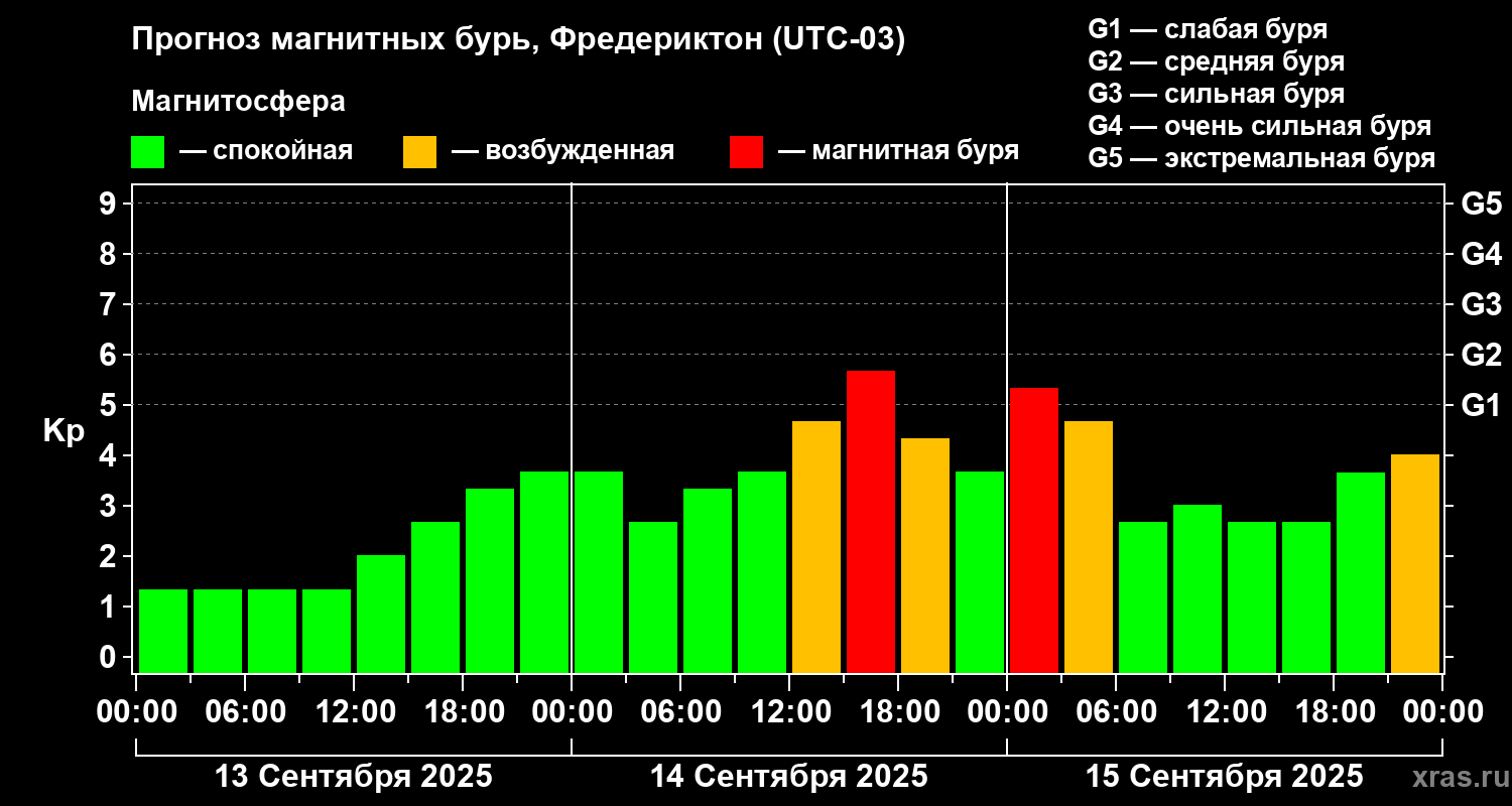 Прогноз магнитных бурь в Фредериктоне — 13 сентября 2025 года
