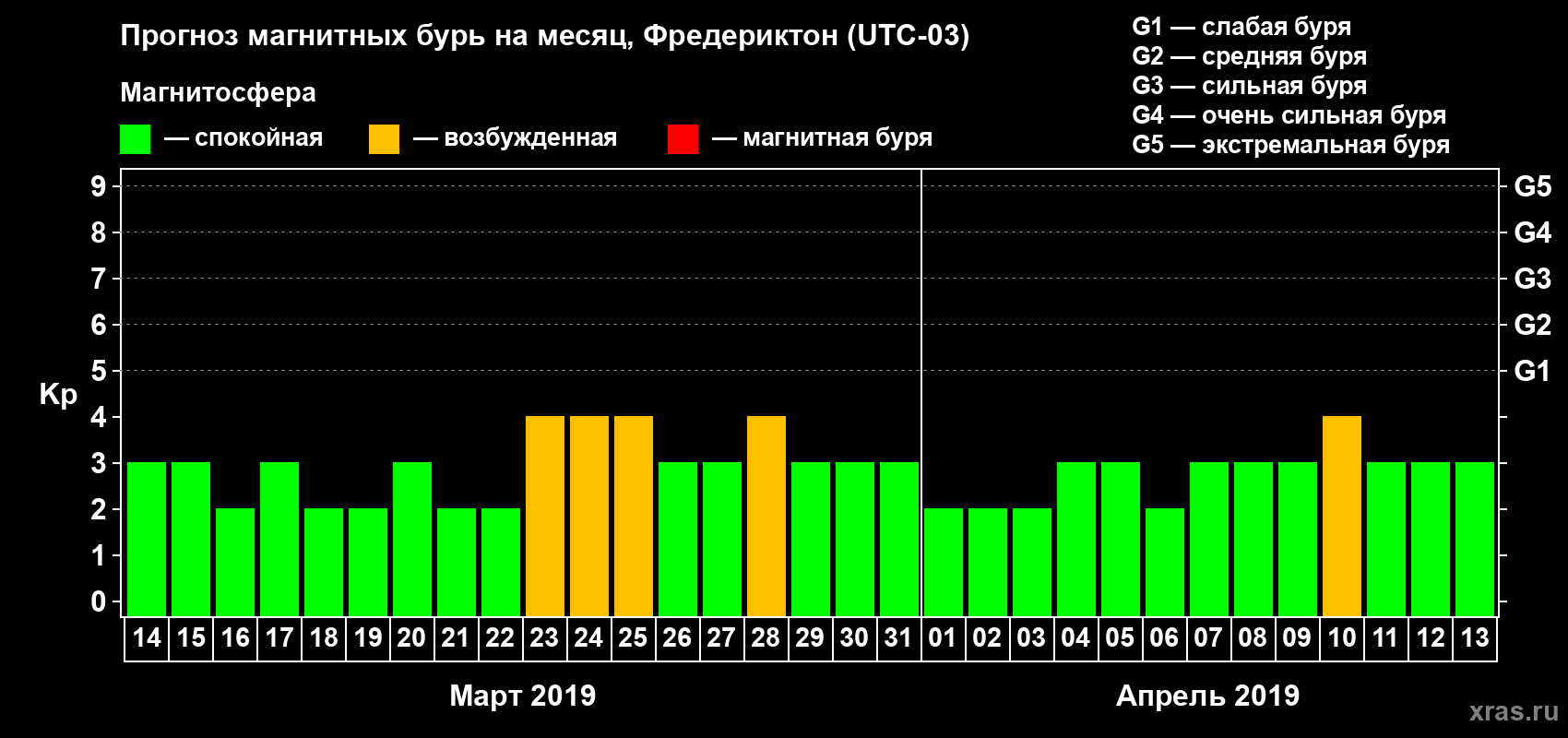 Прогноз магнитных бурь в Фредериктоне — 14 марта 2019 года