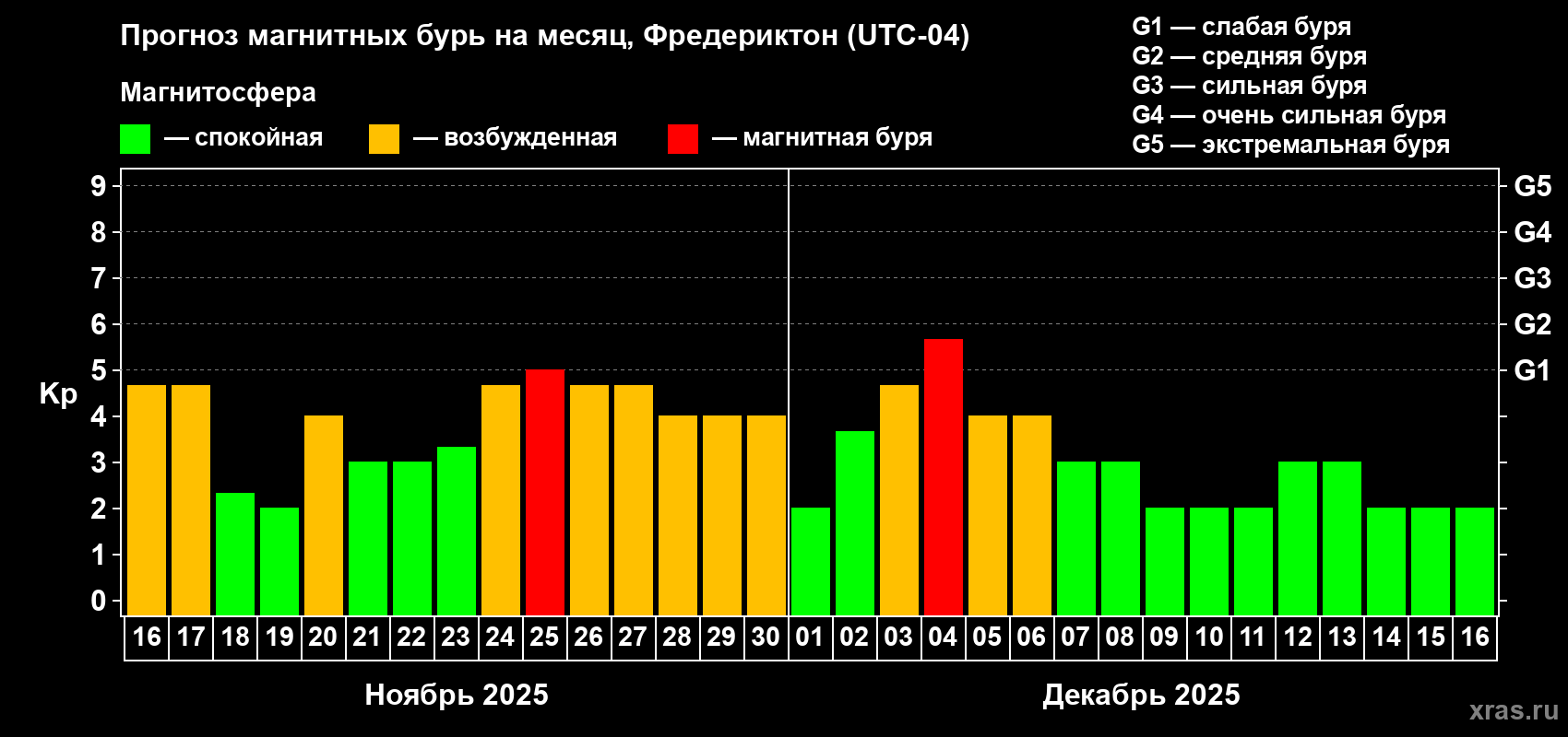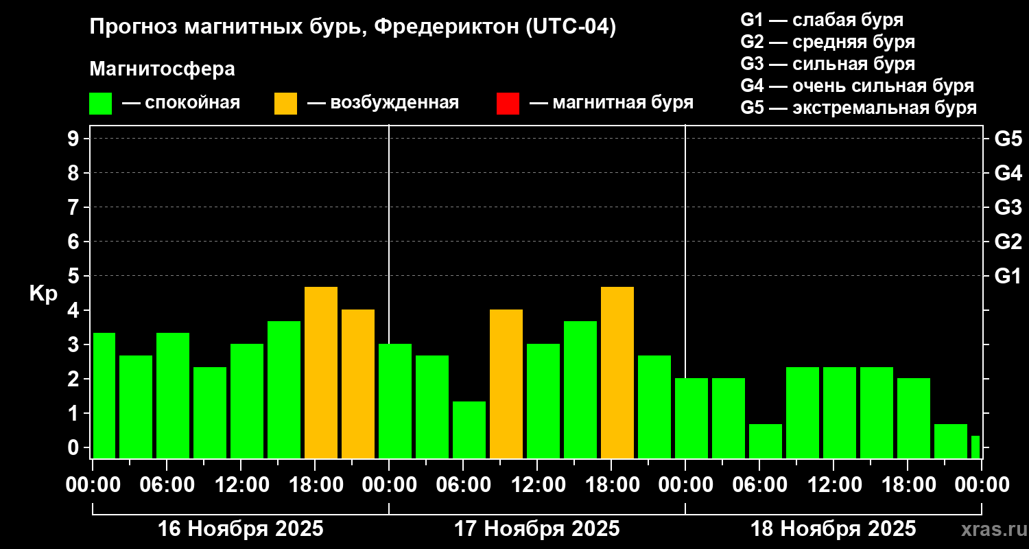 Прогноз магнитных бурь в Фредериктоне — 16 ноября 2025 года