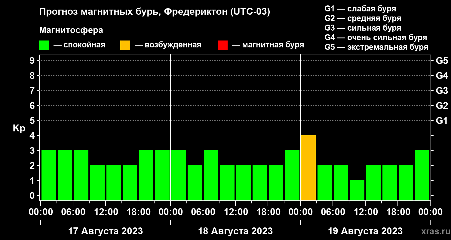 Прогноз магнитных бурь в Фредериктоне — 17 августа 2023 года