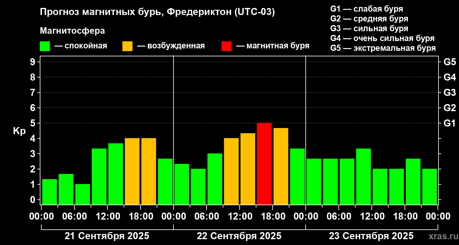 Прогноз магнитных бурь в Фредериктоне — 21 сентября 2025 года