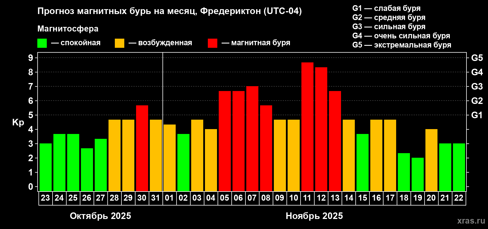 Прогноз магнитных бурь в Фредериктоне — 23 октября 2025 года