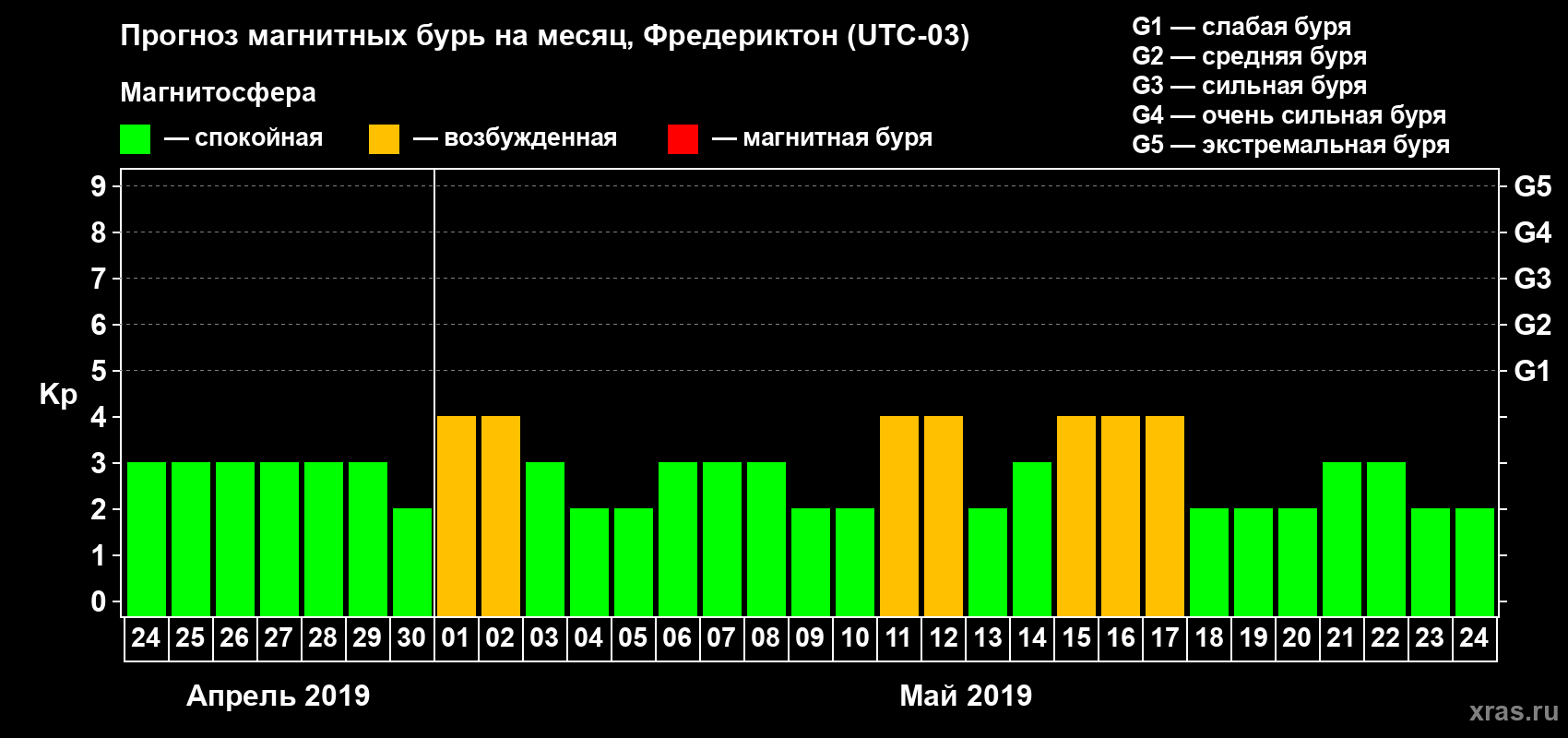 Прогноз магнитных бурь в Фредериктоне — 24 апреля 2019 года