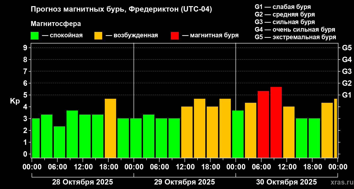 Прогноз магнитных бурь в Фредериктоне — 28 октября 2025 года