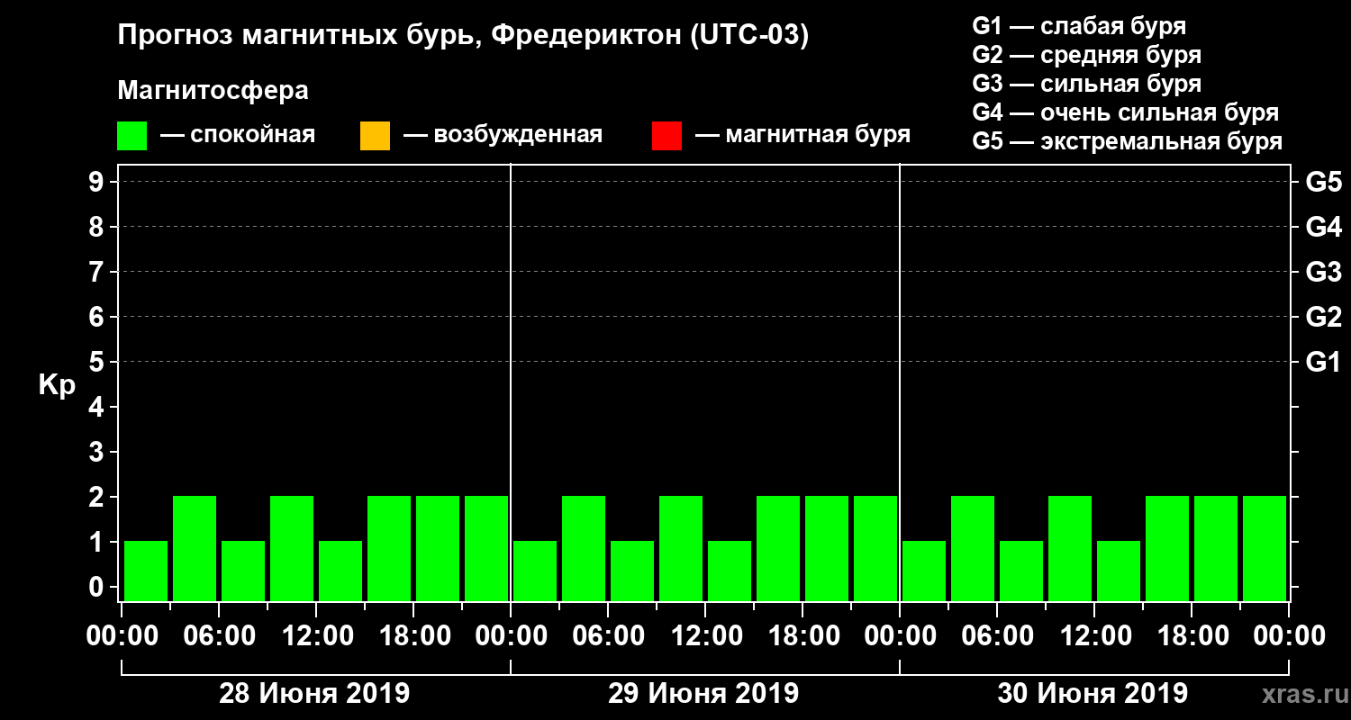 Прогноз магнитных бурь в Фредериктоне — 28 июня 2019 года