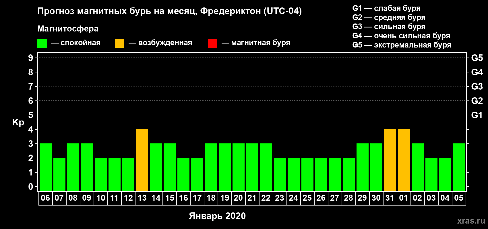 Прогноз магнитных бурь в Фредериктоне — 6 января 2020 года
