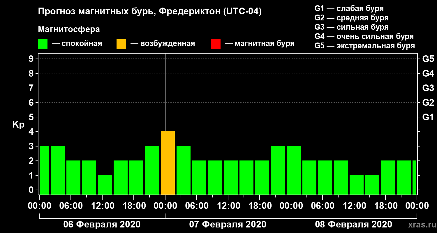 Прогноз магнитных бурь в Фредериктоне на 6 февраля 2020 года