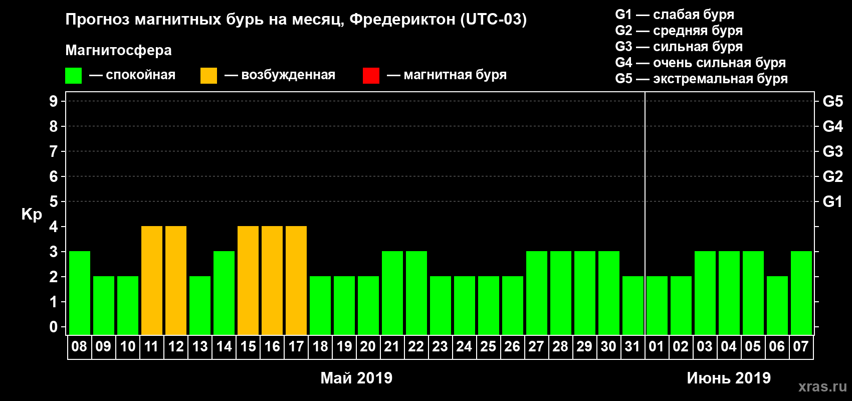 Прогноз магнитных бурь в Фредериктоне — 8 мая 2019 года