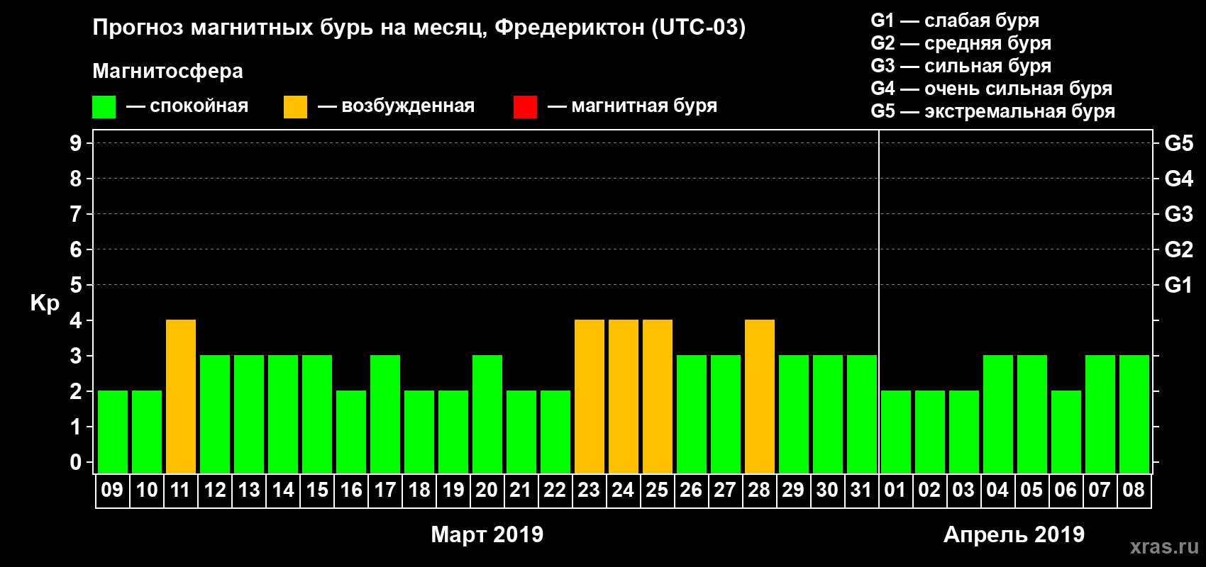 Прогноз магнитных бурь в Фредериктоне — 9 марта 2019 года