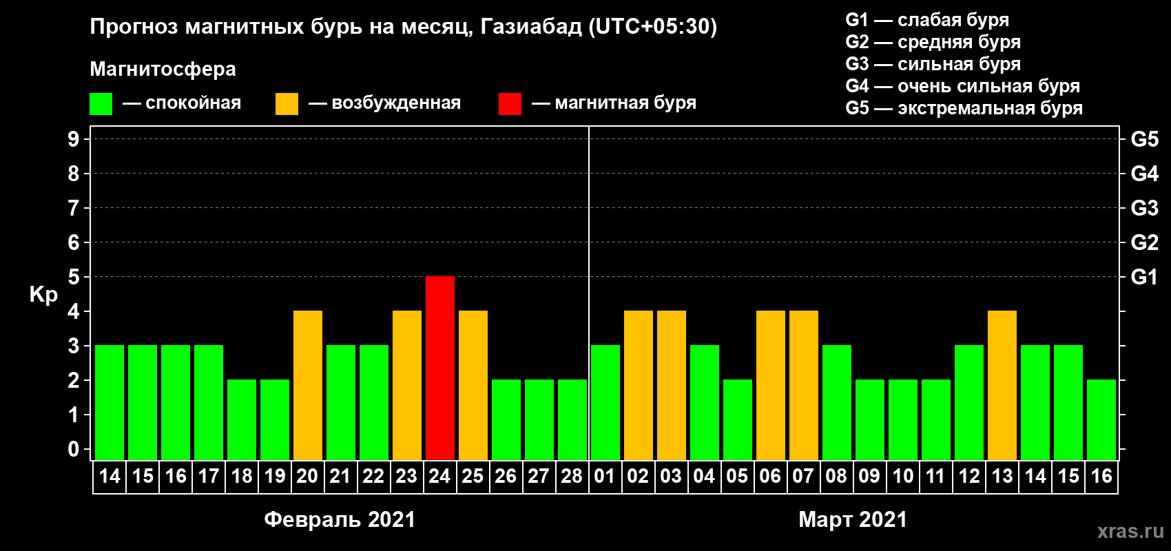 Прогноз магнитных бурь в Газиабаде — 14 февраля 2021 года