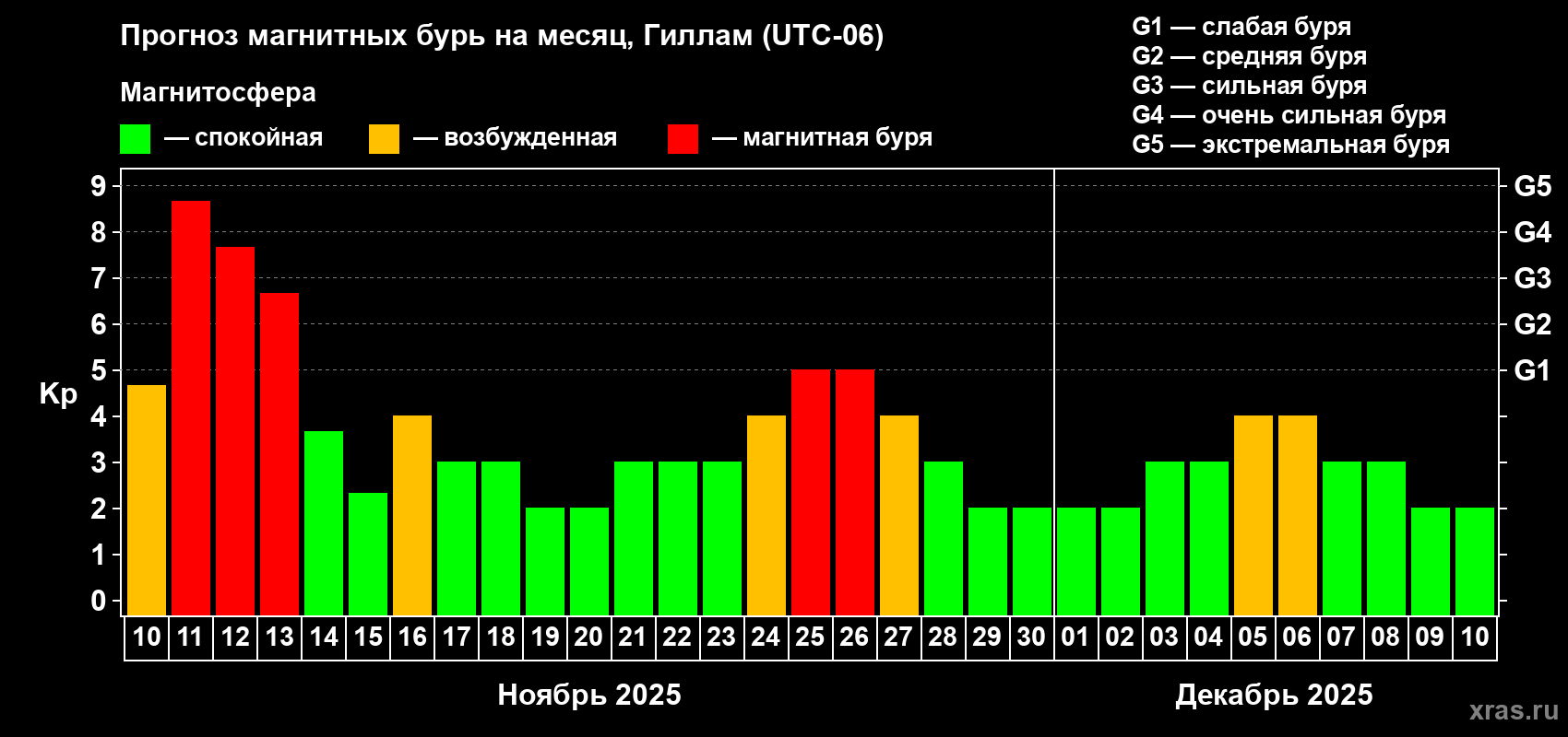 Прогноз магнитных бурь в Гилламе — 10 ноября 2025 года