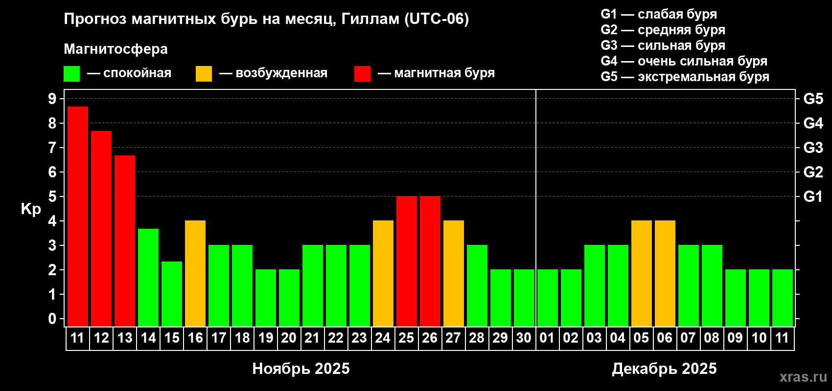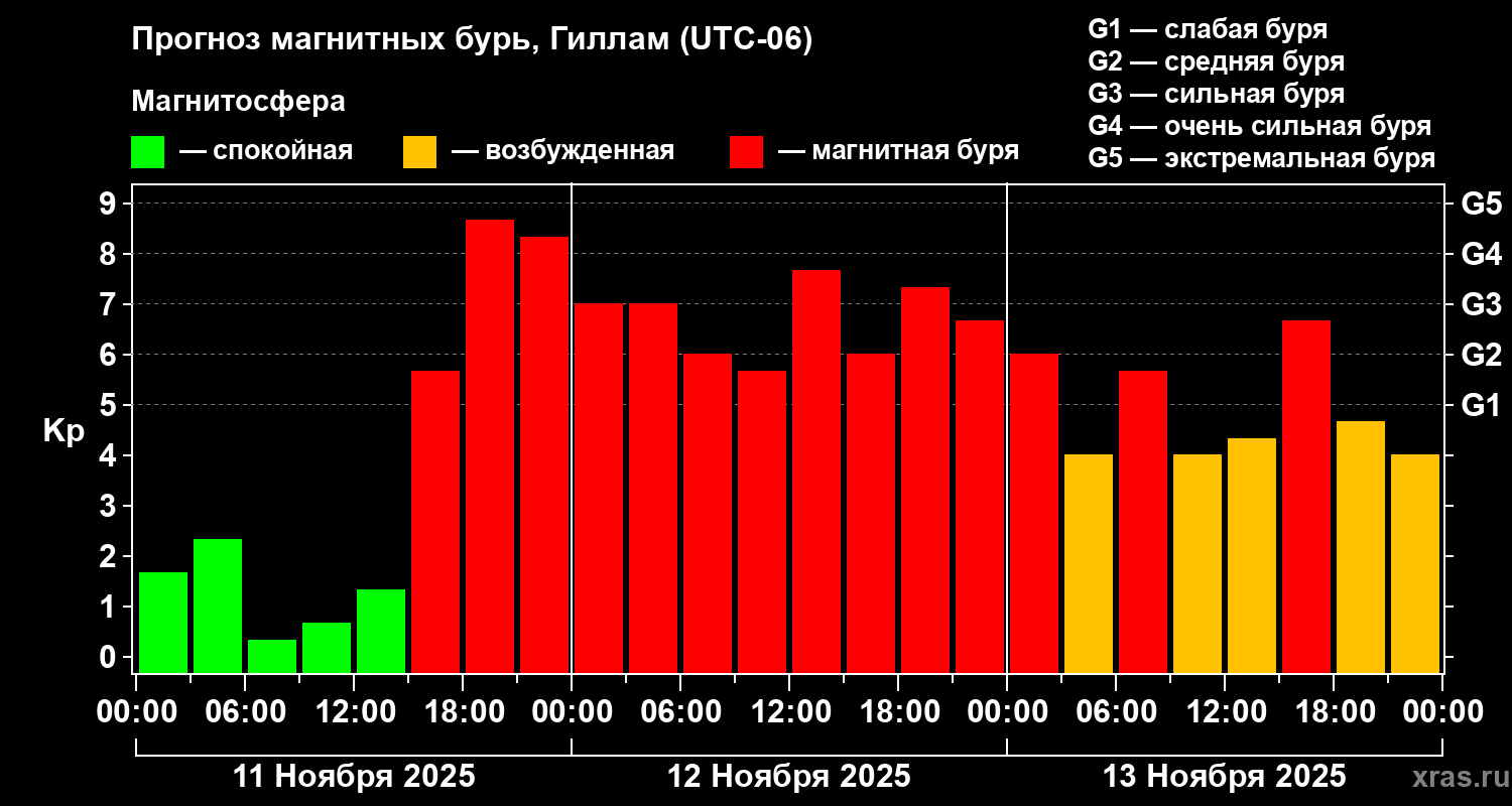 Прогноз магнитных бурь в Гилламе — 11 ноября 2025 года